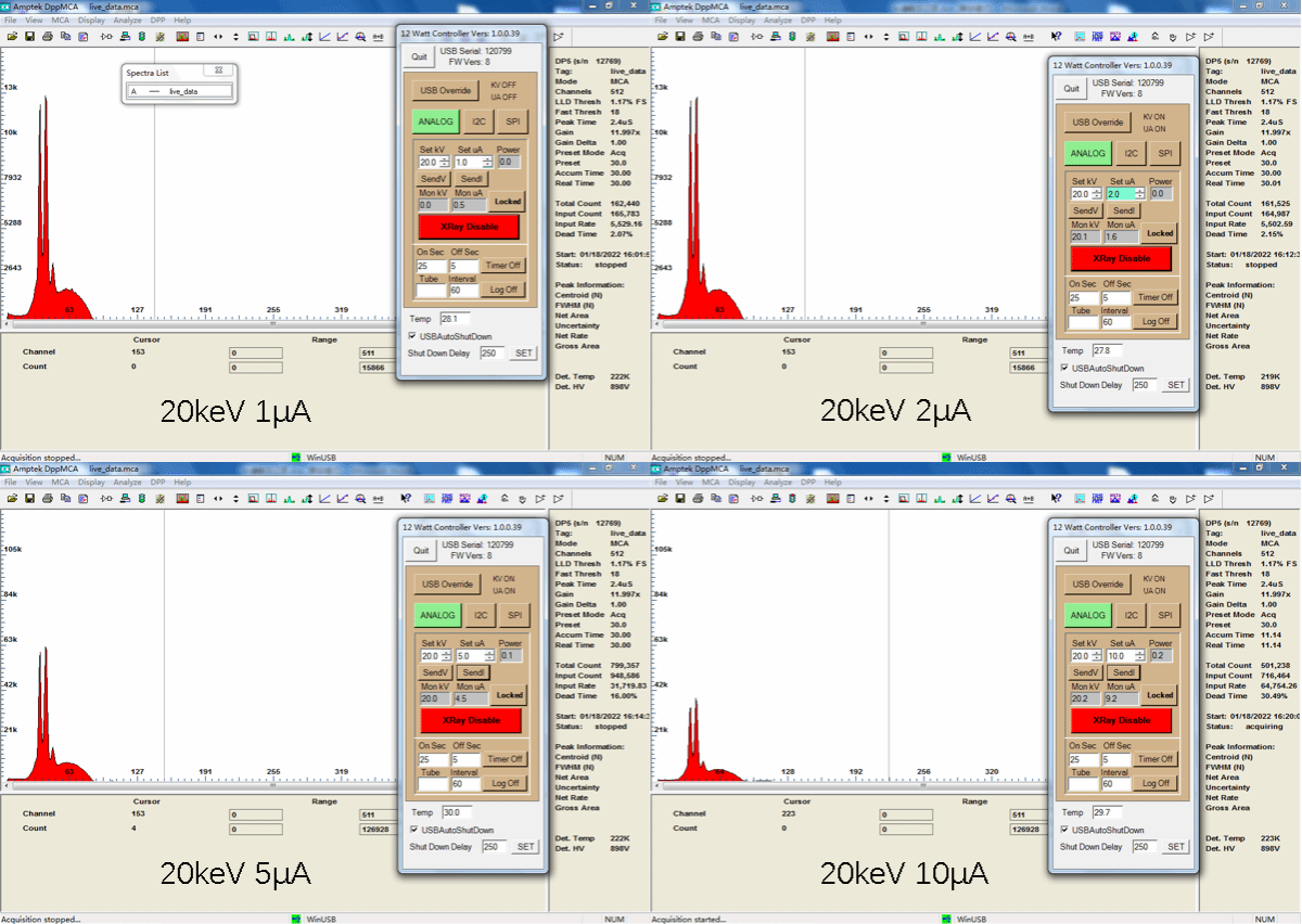 Only the spectral distortion images at four different current sizes at 20keV are shown here, and some of the original data are attached, if you need more original files of voltage and current parameters, please contact the laboratory leader.