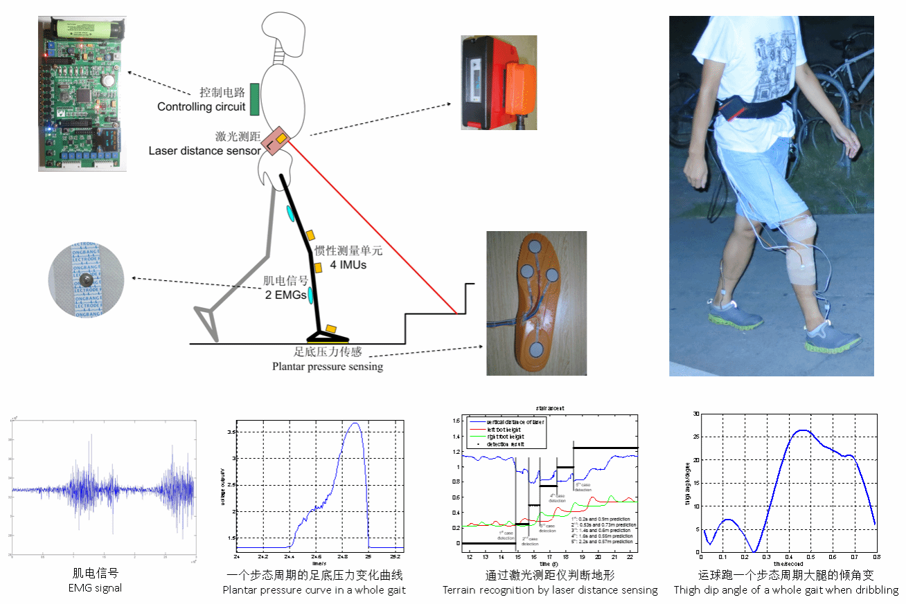 The outdoor wearable biomechanical signal acquisition system can simultaneously collect plantar pressure, IMU, EMG, and laser ranging signals. The system is powered by a 3.7V lithium battery, and all data is stored on the onboard SD card, which can complete the function of signal acquisition without the need for a computer, which is convenient for outdoor wear experiments, and is very suitable for use in rehabilitation engineering-related research institutions. The device also integrates an optimized intelligent algorithm software interface, which can be transformed into a sensing and control unit for intelligent rehabilitation aids according to user needs.