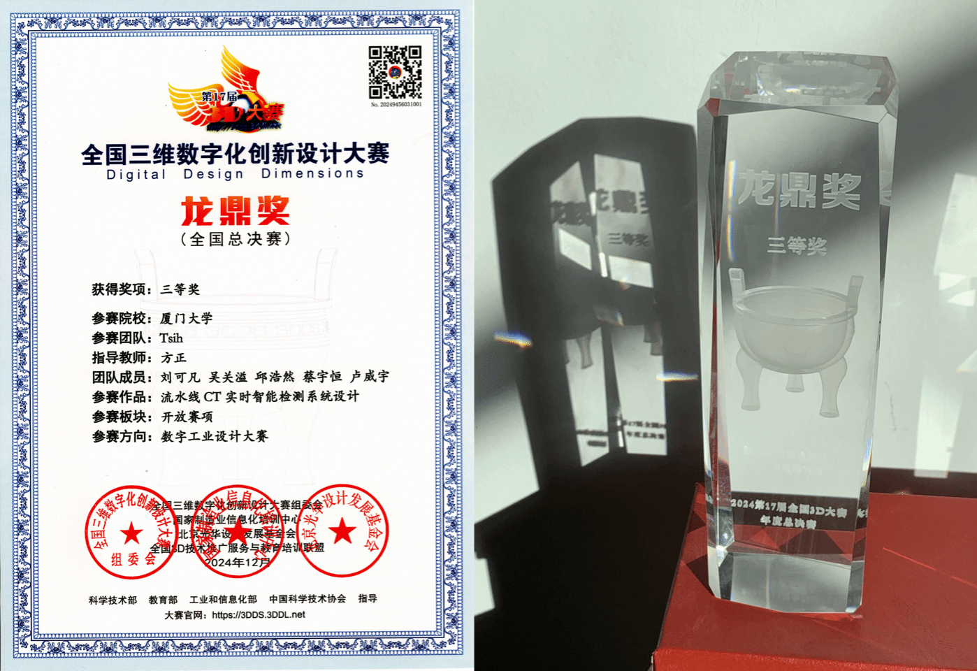 2024年12月,伴随着全国三维数字化创新设计大赛全国总决赛的揭晓,来自厦门大学航空航天学院的“Tsih”团队凭借其《流水线CT实时智能检测系统设计》项目,在数字工业设计赛道中脱颖而出,荣获本次大赛三等奖。大赛由科学技术部、教育部、工信部与中国科协联合指导,汇聚了国内顶尖高校的创新力量,“Tsih”团队的出色表现赢得了评委与观众的一致认可。