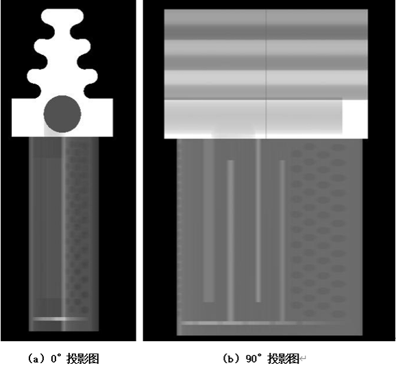 根据X射线检测设备的硬件需求确定各项参数,探测器成像每个像素为0.2mm,光源距离探测器约1.7m,且不考虑被测物体的材料差异。选用图3-2所示航空叶片零件模型进行X射线成像仿真,选用仿真软件为Matlab,分别在投影角度为0°和90°时采集仿真成像。平行光仿真结果如下图所示。