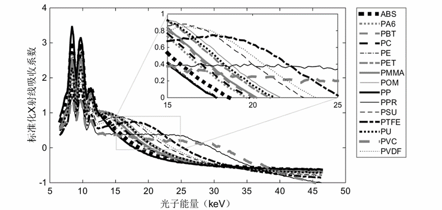 下图是15种塑料的X射线吸收光谱对比,可以看出在15到25 keV区间的光谱特征差异非常明显。